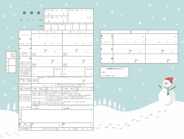 降り積もる雪のように思い出を重ねて、愛を育んでいきたいおふたりへ。温かいマフラーを巻いた雪だるまが、どんな寒い冬でもふたりの絆を暖かく保ちます。冬の入籍をされるおふたりや、穏やかな家庭を築きたいカップルにぴったりの一枚です。