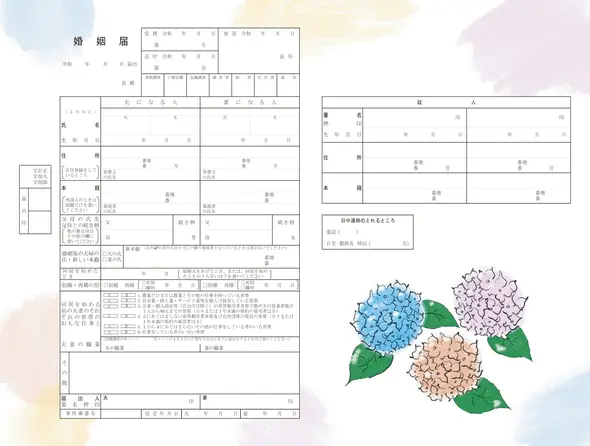 雨上がりにきらめく紫陽花に、季節を重ねるほど深まっていくふたりの絆を重ねて。梅雨の時期に入籍をするカップルや、落ち着いた華やかさを大切にしたいおふたりにぴったりの婚姻届です。