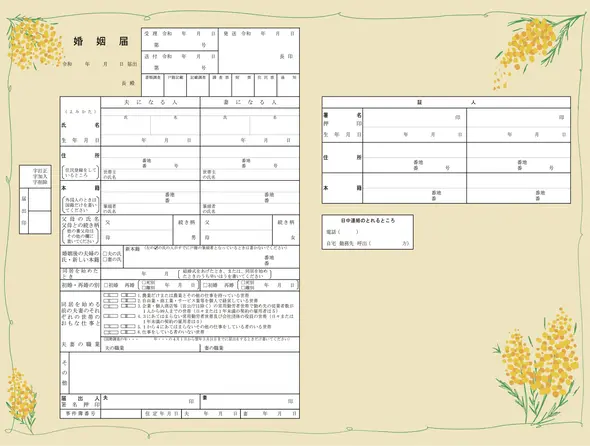 春の訪れを告げるミモザに、ふたりのこれからが明るく彩られていく願いを込めて。ナチュラルであたたかな雰囲気を大切にしたいおふたりにぴったりの婚姻届です。