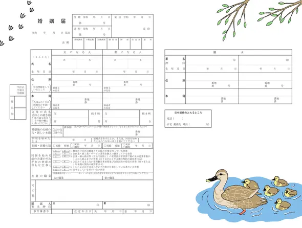 水面をゆっくり進むカモの親子に、これから始まる毎日が穏やかに続いていく願いを込めて。そばで寄り添い、あたたかさが伝わるデザインは、家族の時間を大切にしたいおふたりにぴったりの婚姻届です。