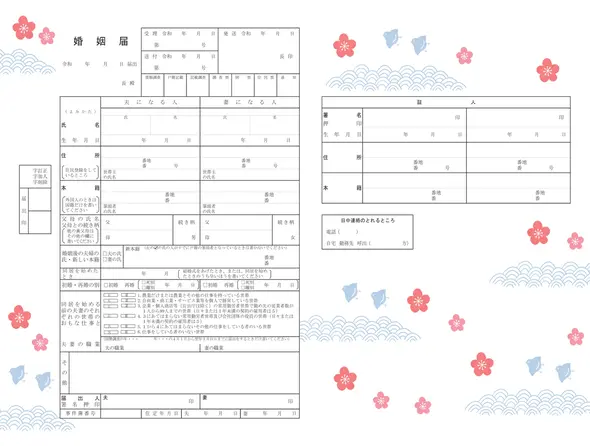 背景を彩る和柄や花火から華やかな印象を感じられる一枚で、花火に思い出があるふたりだけでなく、和風の婚姻届をお探しのふたりにも使っていただきたい婚姻届です。