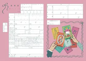 桜をモチーフにしたacaleeとエニマリのオリジナルコラボデザインの婚姻届です。淡い桜色の背景に描かれたのは可憐な桜の花モチーフ。右下にはふたりをつなぐ「&」の文字を入れたフリースペースを設け、ふたりの名前を記入したり、指輪を置いて記念撮影ができるようにしました。