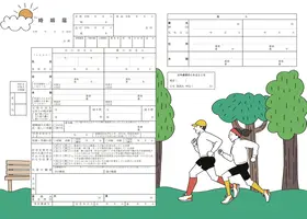たべことエニマリのオリジナルコラボデザインの婚姻届です。マルチーズをテーマにしたデザインです。白くてまるまるしたマルチーズと、ピンクのリボンや肉球のモチーフを描きました。