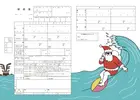 akaneとエニマリのオリジナルコラボデザインの婚姻届です。常夏のビーチでサーフィンを楽しむサンタクロースを描いた、ポップでユニークな婚姻届です。波間からは可愛らしいトナカイが顔をのぞかせ、遊び心満載のデザインに仕上げています。