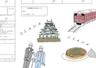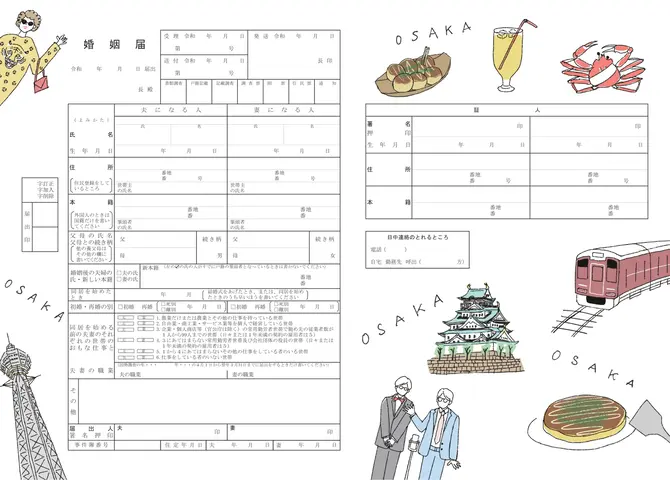 大阪をモチーフにした、日音もすとエニマリのオリジナルコラボデザインの婚姻届です。大阪城や通天閣、そしてお好み焼きなどの名物を、手書き風の温かいタッチで描きました。大阪愛あふれるデザインに仕上げています。