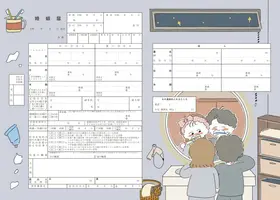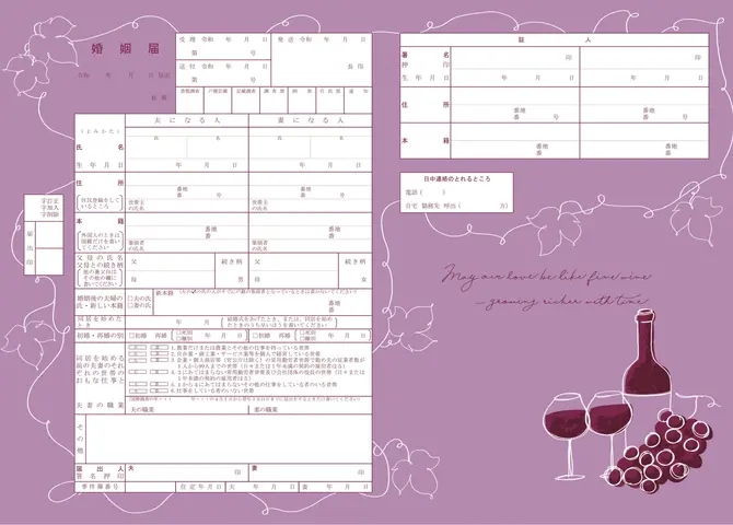 akaneとエニマリのオリジナルコラボデザインの婚姻届です。赤ワインと葡萄をモチーフにした、エレガントで大人っぽいデザイン。落ち着いたボルドー系の色合いを基調とし、葡萄の葉やツルを繊細に描き込みました。