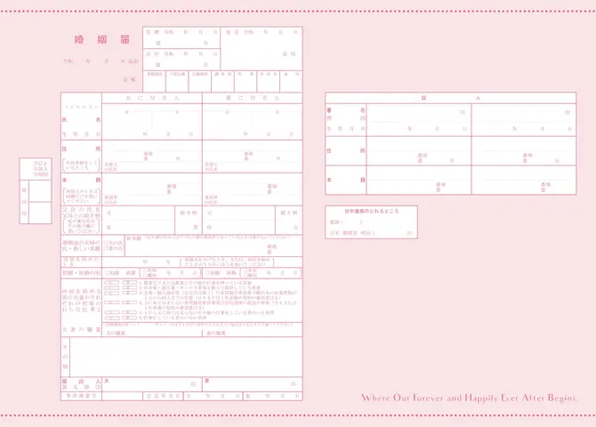 4月の満月「ピンクムーン」をテーマにした、akaneとエニマリのオリジナルコラボデザインの婚姻届です。柔らかなベビーピンクを基調とした、シンプルで洗練されたデザイン。上下に施された繊細なドットのラインが、さりげない可愛らしさを演出しています。