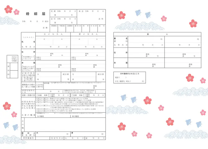 日音もすとエニマリのオリジナルコラボデザインの婚姻届です。日本の伝統的な吉祥文様である「梅」と「波千鳥」をあしらった、気品と可愛らしさが同居するデザインに仕上げています。