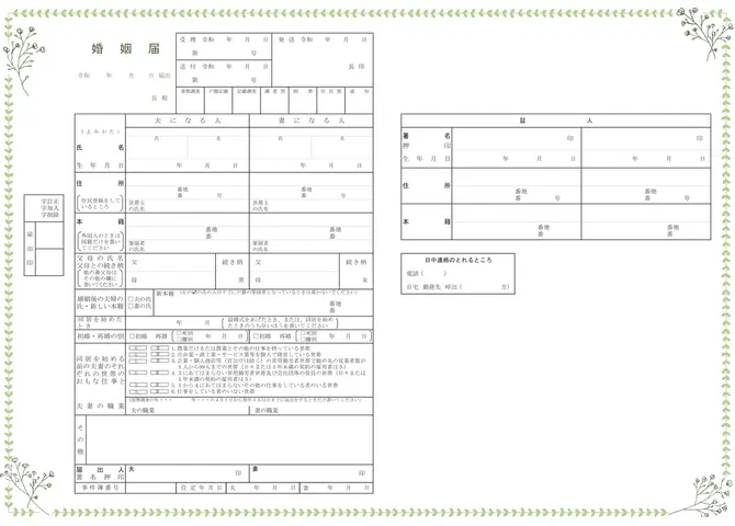 Ai Arakiとエニマリのオリジナルコラボデザインの婚姻届です。繊細で可愛らしいかすみ草をモチーフにした、ナチュラルで清楚なデザインに仕上げています。