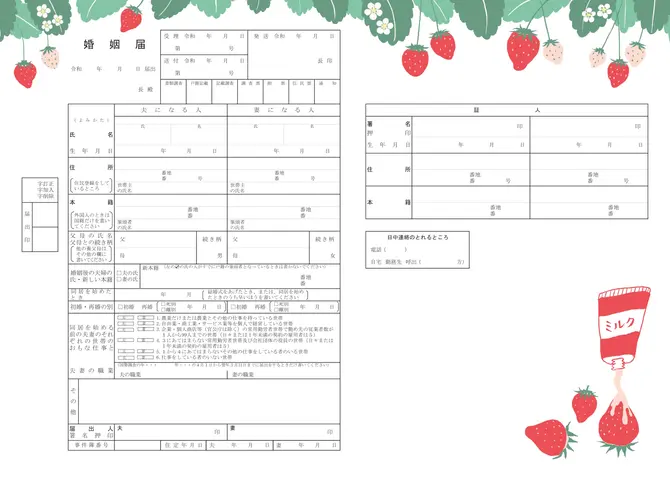 6月の満月「ストロベリームーン」をテーマにした、日音もすとエニマリのオリジナルコラボデザインの婚姻届です。真っ赤に実ったいちごと、練乳のイラストがワンポイントの可愛らしいデザインに仕上げました。